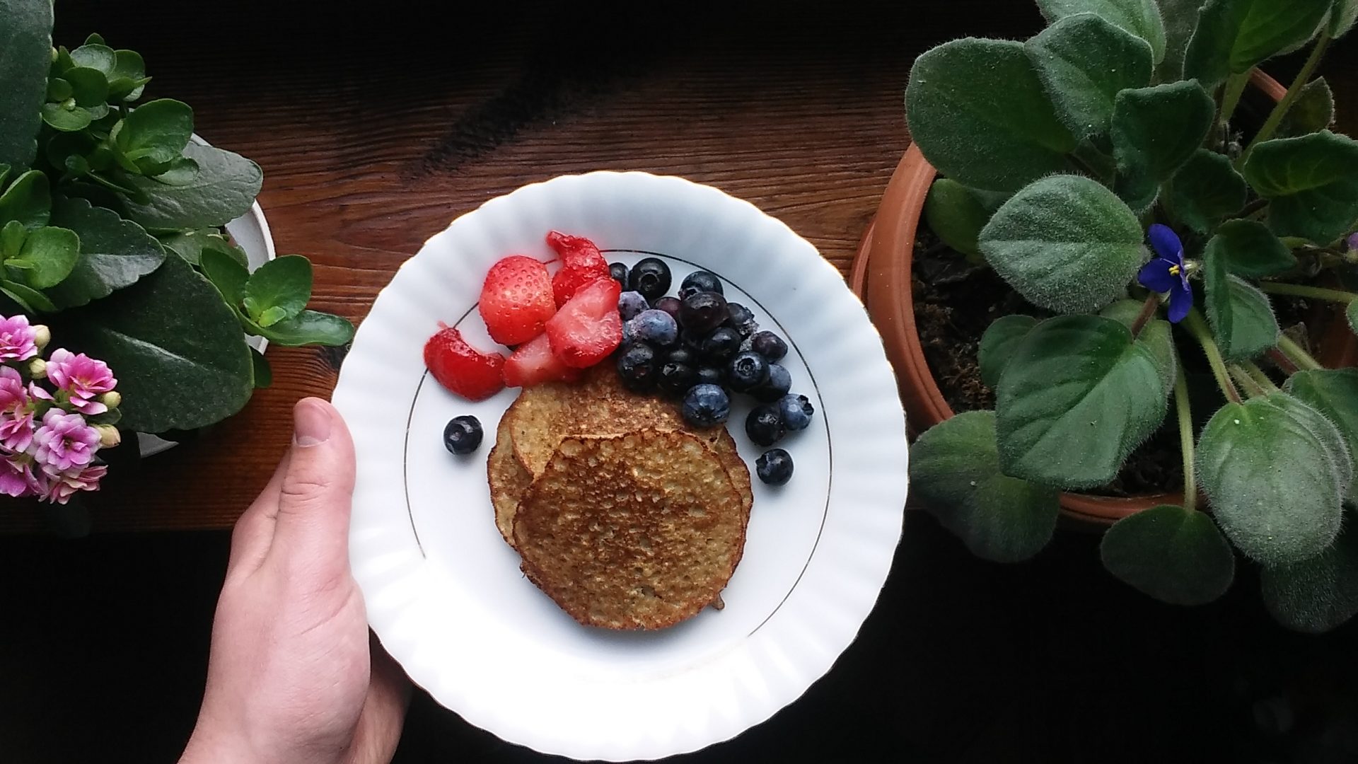 3. Gotowe placuszki ułóż na talerzu i udekoruj owocami.
