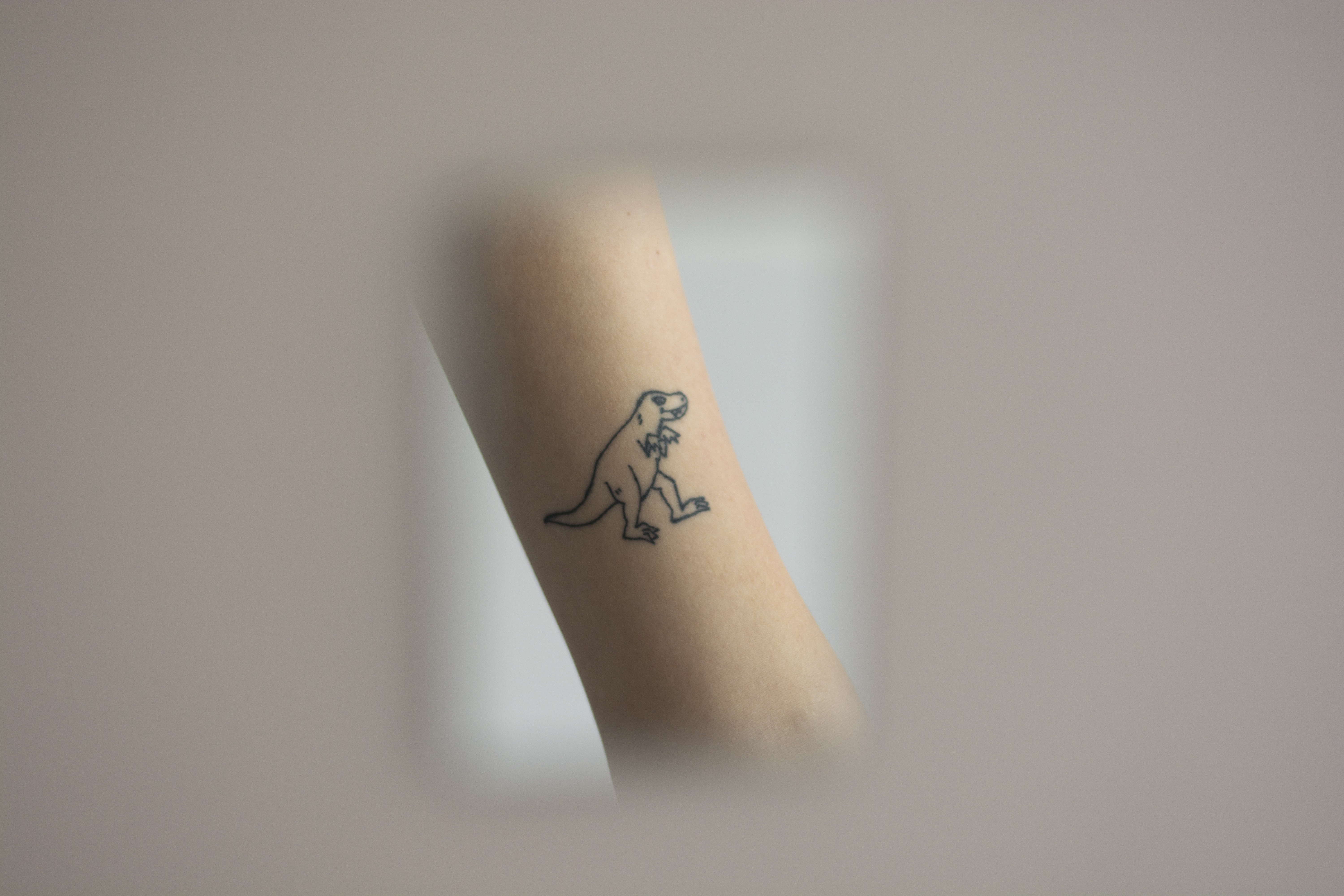 W międzyczasie trafiłam na projekt Sophie Mayanne “Behind the scars” . Jest to projekt brytyjskiej fotograf, która zajmuje się głównie fotografią modową. Sophie od kilku miesięcy fotografuje blizny, by w ten sposób ukazać kryjące się za nimi historie. Napisałam do niej maila, dwa dni później odpisała i podała mi terminy, w których będzie wykonywała kolejne sesje. Umówiłam się z nią na wrzesień, kupiłam bilety lotnicze i poleciałam wziąć udział w jej projekcie. Tydzień później dostałam od niej maila z załączonymi zdjęciami, a kiedy je otworzyłam, popłakałam się. To był przełomowy moment, bo od tamtego dnia patrzę na siebie zupełnie inaczej. Przestałam się chować i częściej mówię o swoich rękach. Stwierdziłam, że był to jeden z ważniejszych momentów w moim życiu. Stąd wziął się pomysł na tatuaż. Zawsze się śmiałam, że T-rex i ja mamy ze sobą wiele wspólnego, więc nie zastanawiałam się długo nad tym, co sobie wytatuować.