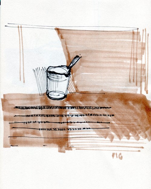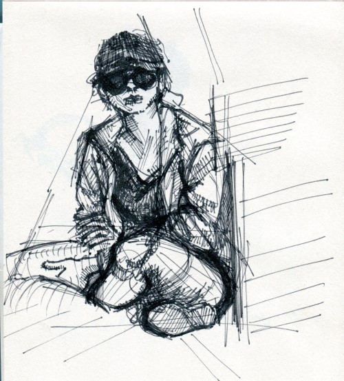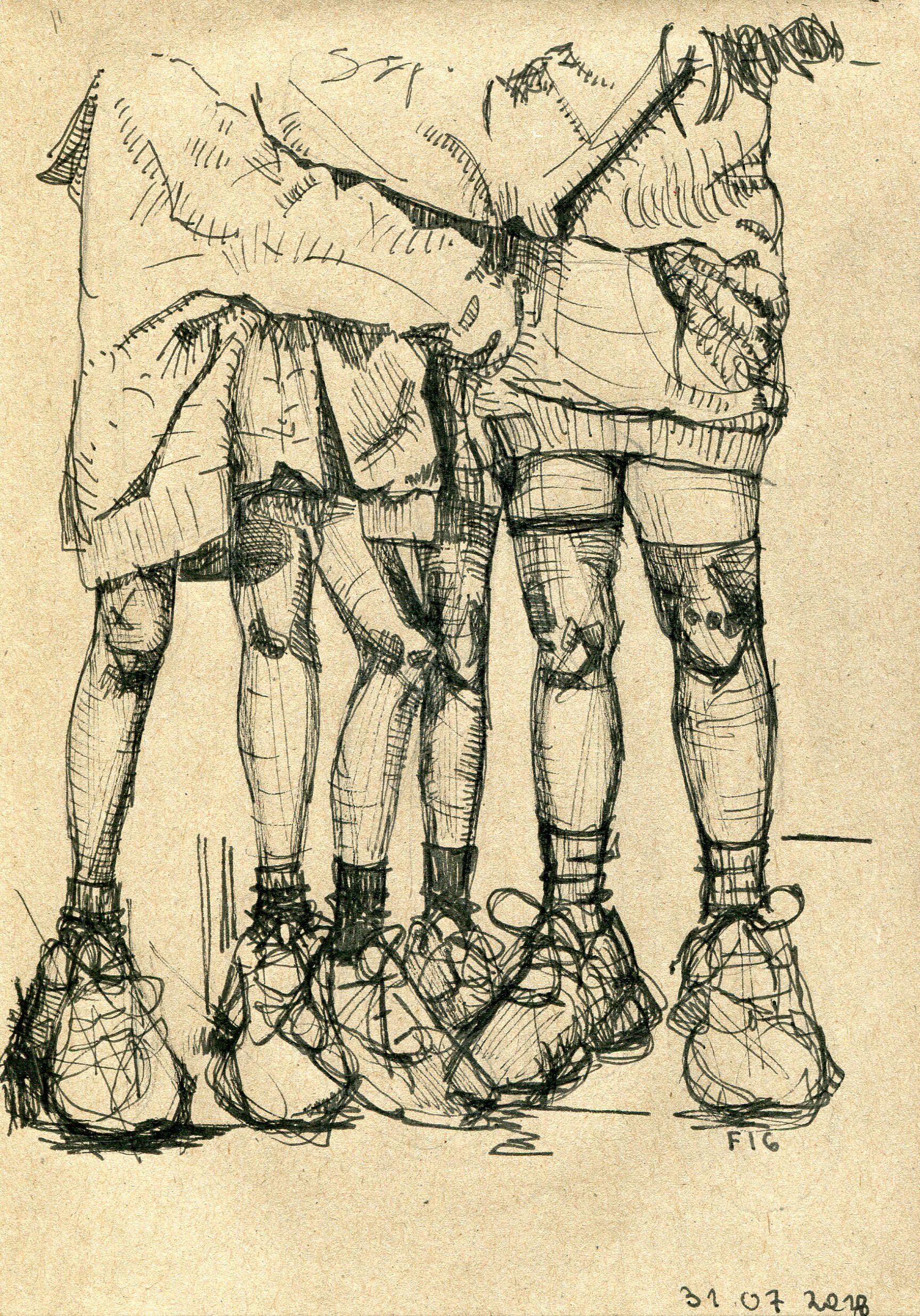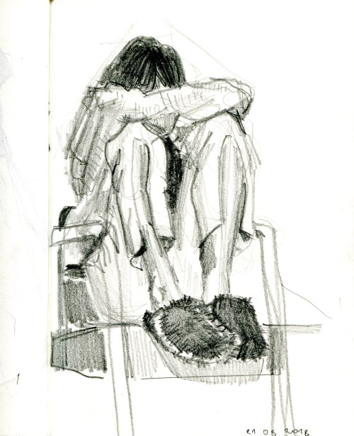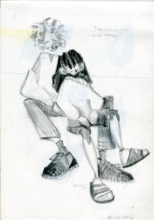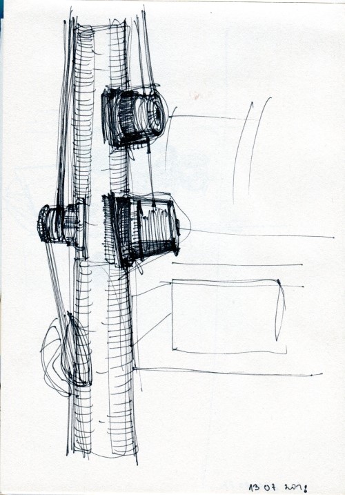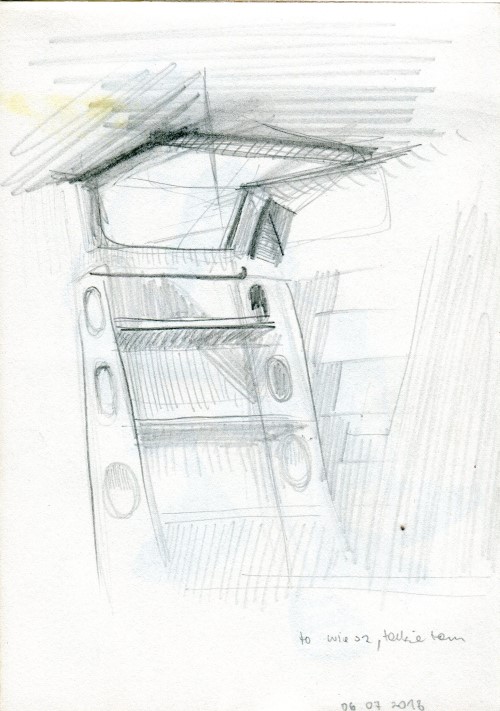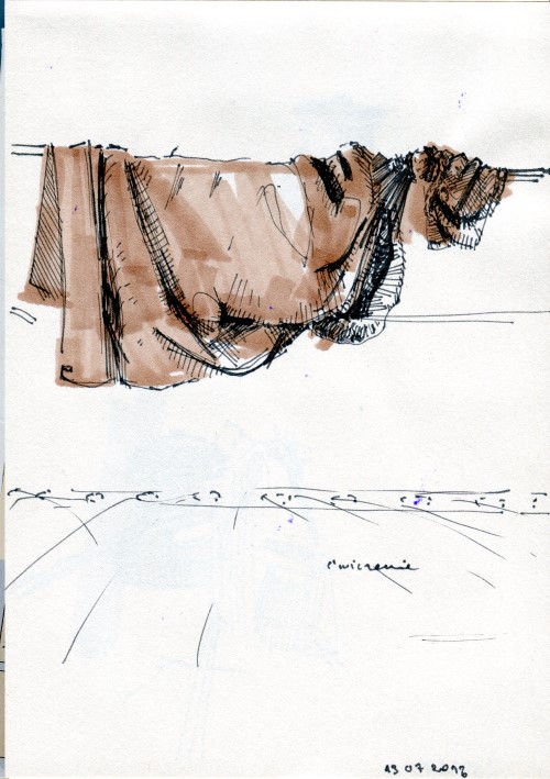 Cienkopis i ołówek, wypadające kartki. ,,Uważaj, żeby nie wypadły za burtę!” Tak się rysuje na łodzi na środku Morza Bałtyckiego. Przesiąknięte morskim powietrzem szkice z wakacji. Bo trzeba ćwiczyć rękę bez przerwy. Na skanie nie widać, że trochę się pogniotły, zwiotczały. Ale rysowanie w trakcie wydarzeń, rozmowy robi osobną historię dla każdego szkicu, i to, według mnie, jest ekscytujące. Liczą się te ,,dobre” i te ,,złe”, ponieważ każde mają bagaż wspomnień.