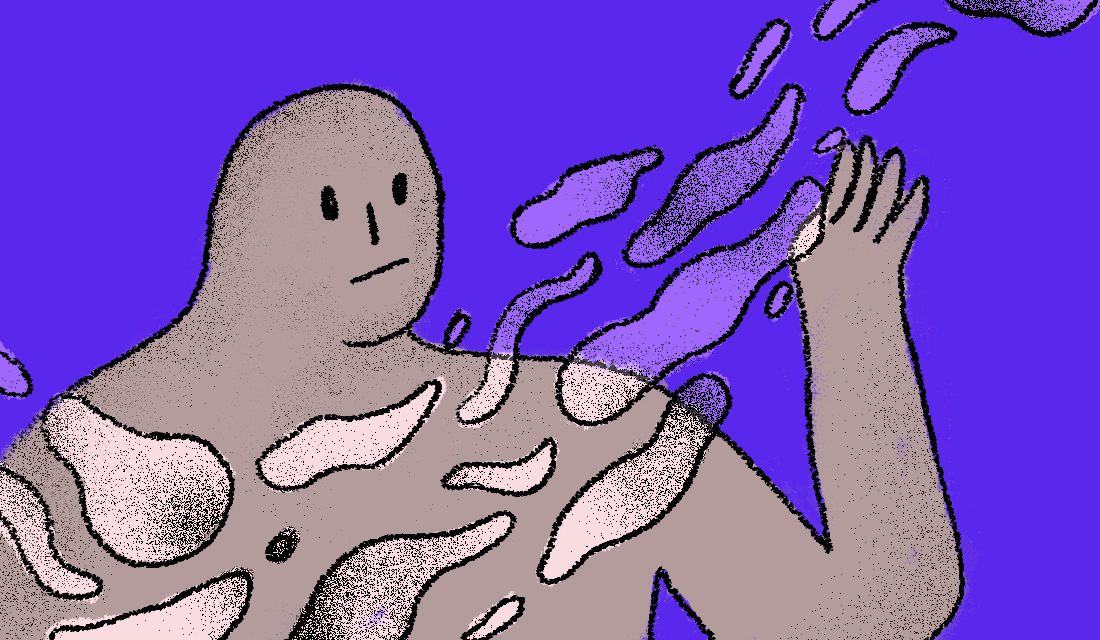 Ilustracja przedstawia postać ludzką przed którą unoszą się przezroczyste, abstrakcyjne kształty - jakby strzępy tkaniny